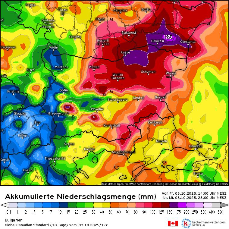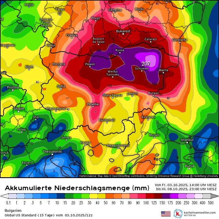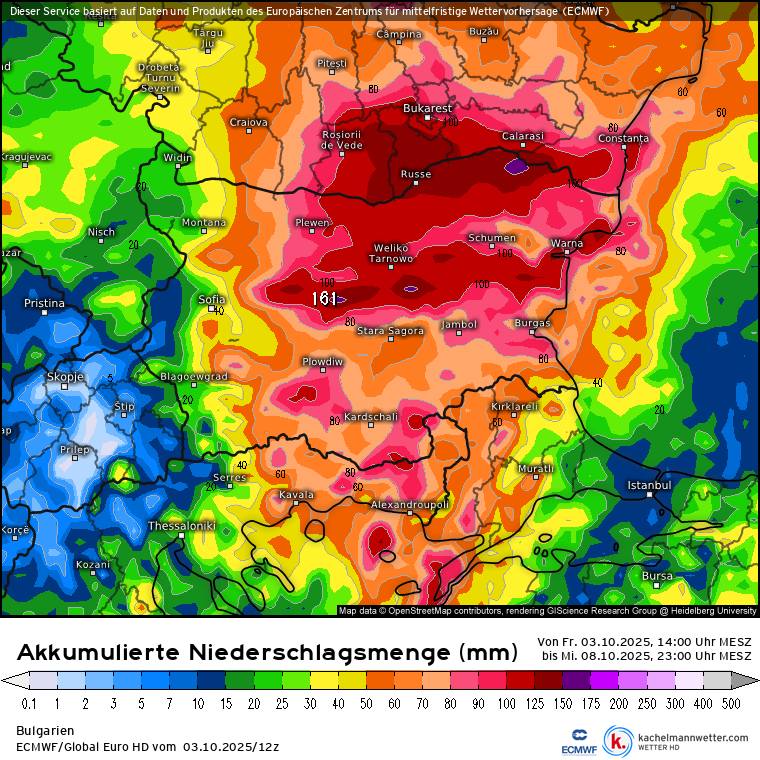 Според регионалния модел Swiss HD ECMWF, още през нощта срещу неделя и в първата половина на деня се очаква ново активизиране на валежите в югоизточна България. Докато в останалата част от страната дъждовете постепенно ще отслабнат и приключат, то по крайбрежието – особено в Бургаска област и района на Странджа – ще има условия за краткотрайни, но интензивни дъждове, които могат да доведат до усложнения.